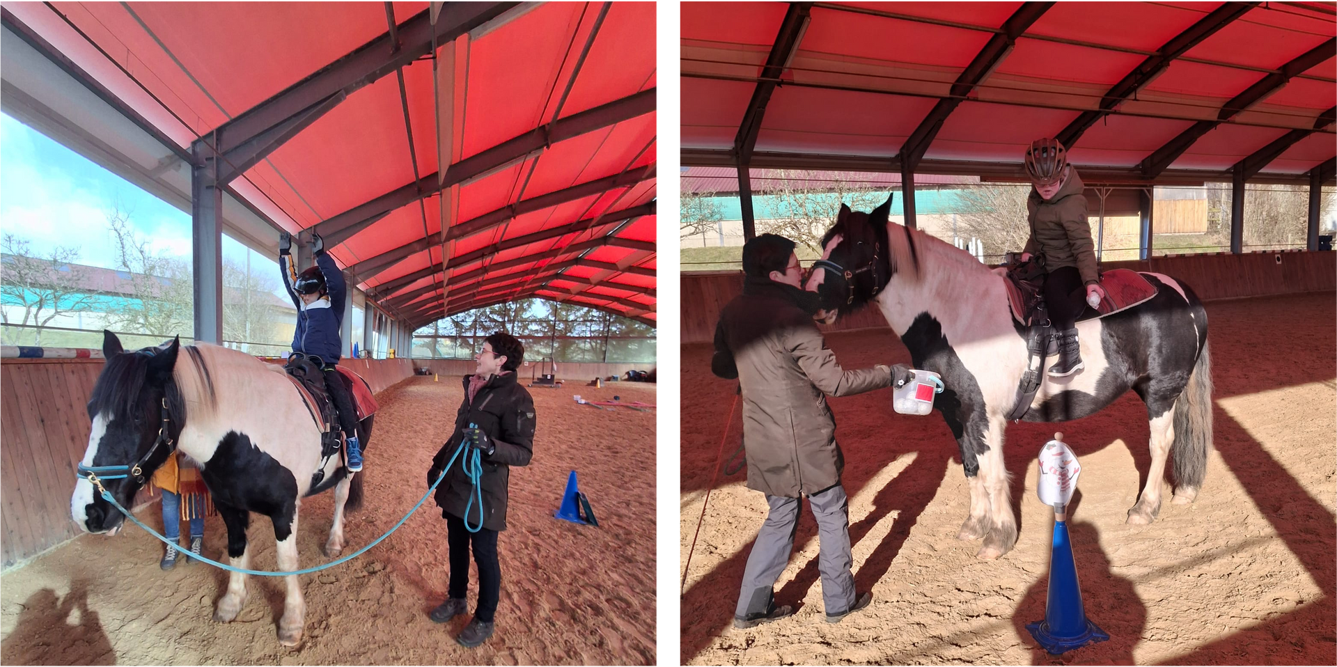 Sehen, Fühlen, Hören, Riechen …. alle Sinne des Menschen werden durch das Tier angesprochen. Dabei geht es nicht nur um das Reiten im engeren Sinne, sondern das ganze „Drumherum“ im Umgang mit dem Pferd spielt eine ebenso wichtige Rolle. Der direkte Kontakt zum Tier ist immer gegeben, egal ob das Pferd gepflegt wird, Übungen am oder auf dem Pferd durchgeführt werden oder Arbeiten im Stall verrichtet werden. So muss beispielsweise schon bei der Pflege des Pferdes der Körper immer dem Putzvorgang angepasst werden. Arme und Beine werden gestreckt, um Rücken, Hals, Kruppe und Mähne des Pferdes zu erreichen, oder ein Beugen ist erforderlich beim Putzen von Bauch und Beinen. Kraftdosierung ist dabei ebenso gefordert wie auch ein