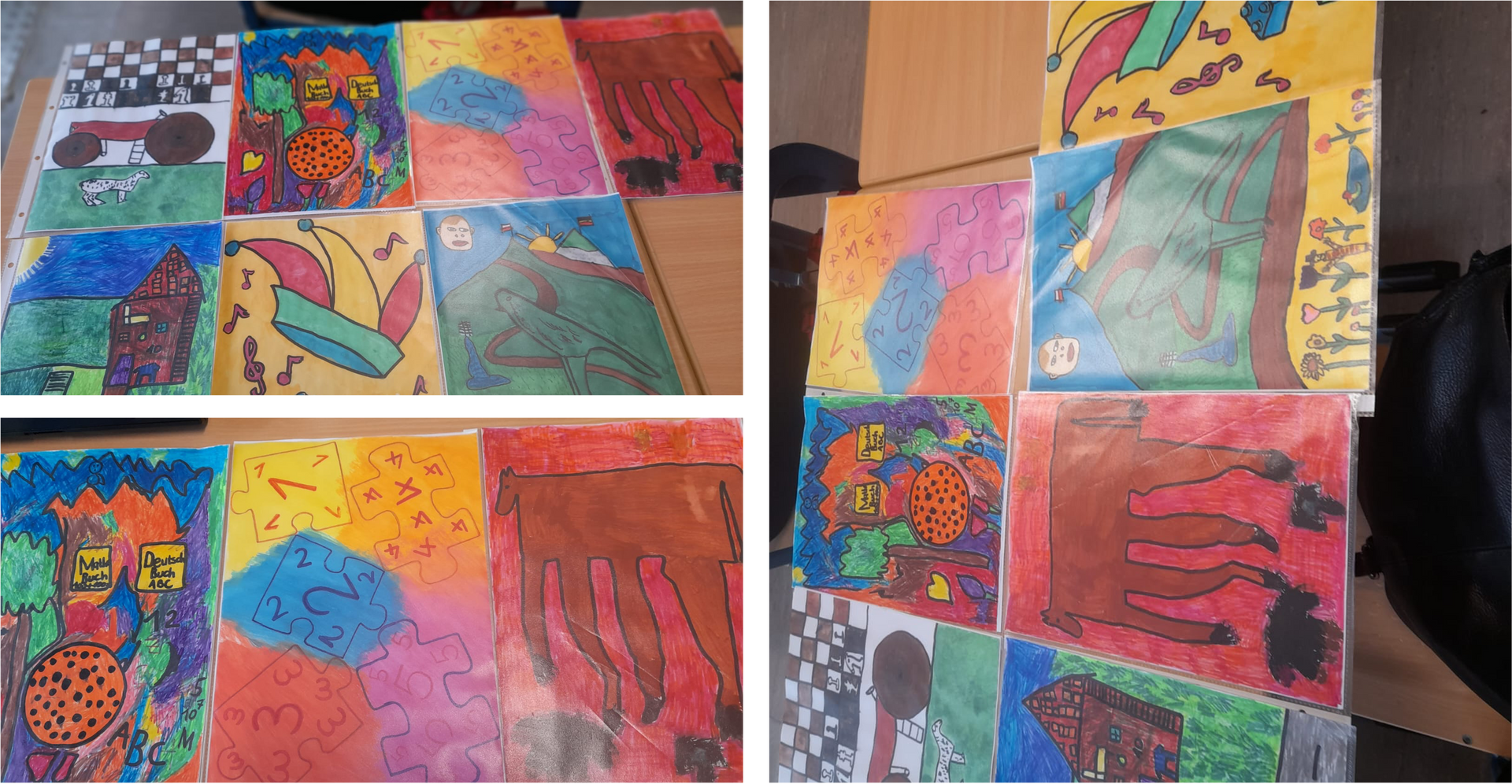Die S2 hat im Kunstunterricht mit Frau Schulzig die Geschichte von der kleinen Schildkröte Ella gehört. Dann haben die Kinder dazu ein Bild von der Schildkröte gestaltet. Zunächst wurde das Meer mit Wasserfarben in der Nass-in-Nass-Technik gemalt. Dann wurden Algen ausgeschnitten und aufgeklebt. Schließlich wurde die Schildkröte mit Wachsmalkreide ausgemalt, mit einem kleinen 3-D-Effekt zusammengeklebt und zur Collage hinzugefügt.